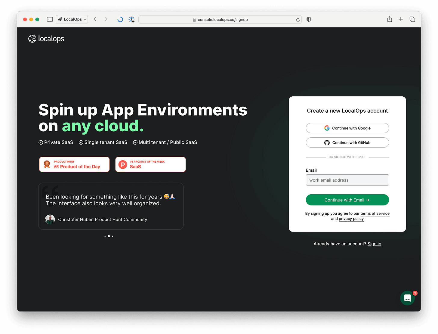 Devs can now Sign up or Sign In instantly ⚡️ into LocalOps with 1-click, using their Github or Google account. Checkout https://console.localops.co/signup.
