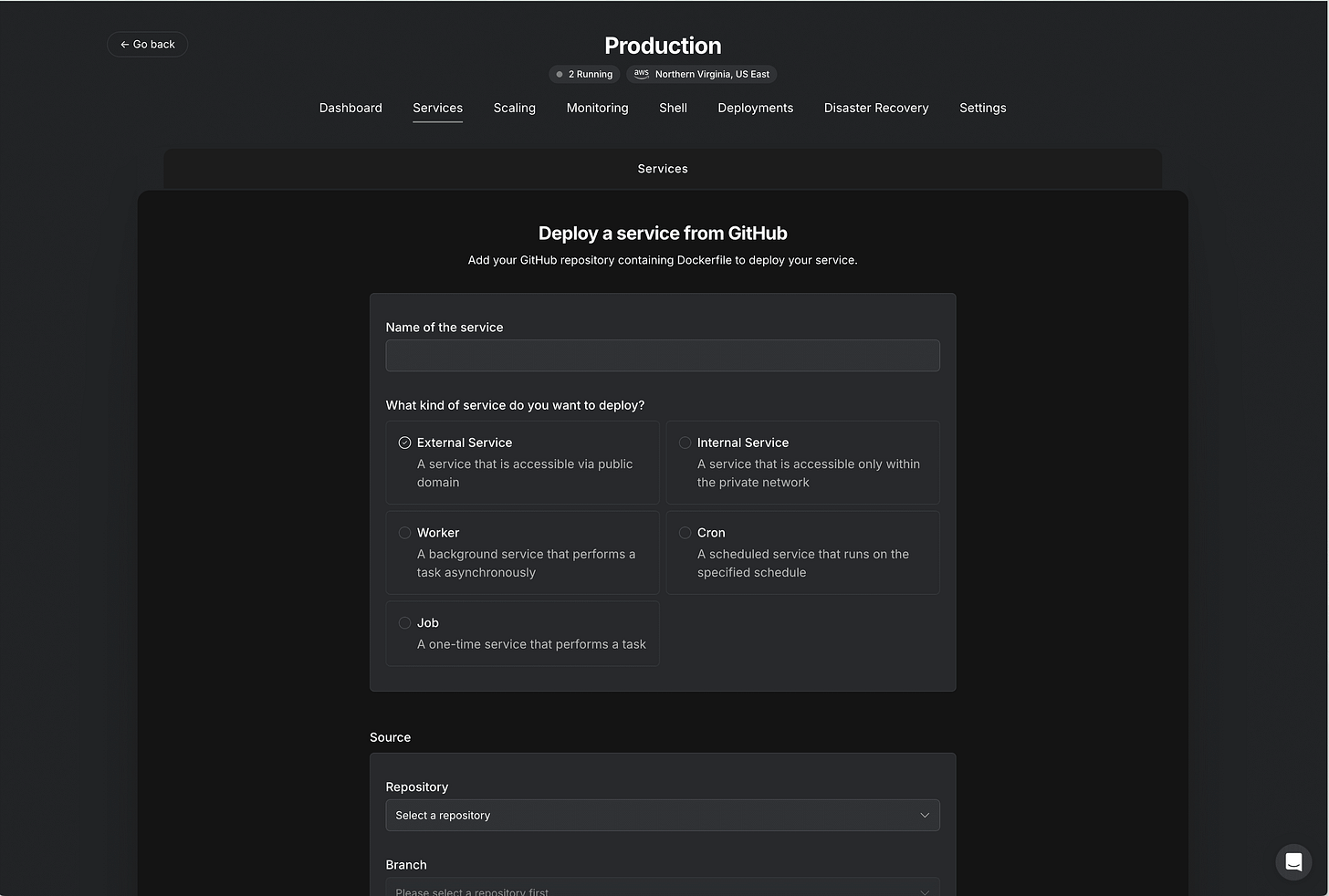 While an “App” in LocalOps asked you earlier to package all your code as a Kubernetes Helm chart and push to registry before deploying it in environments. A “Service” now just needs you to configure a github repo & branch name and push code. LocalOps will then take care of the rest in deploying the latest commit of the branch, on the service running in a specific App environment.