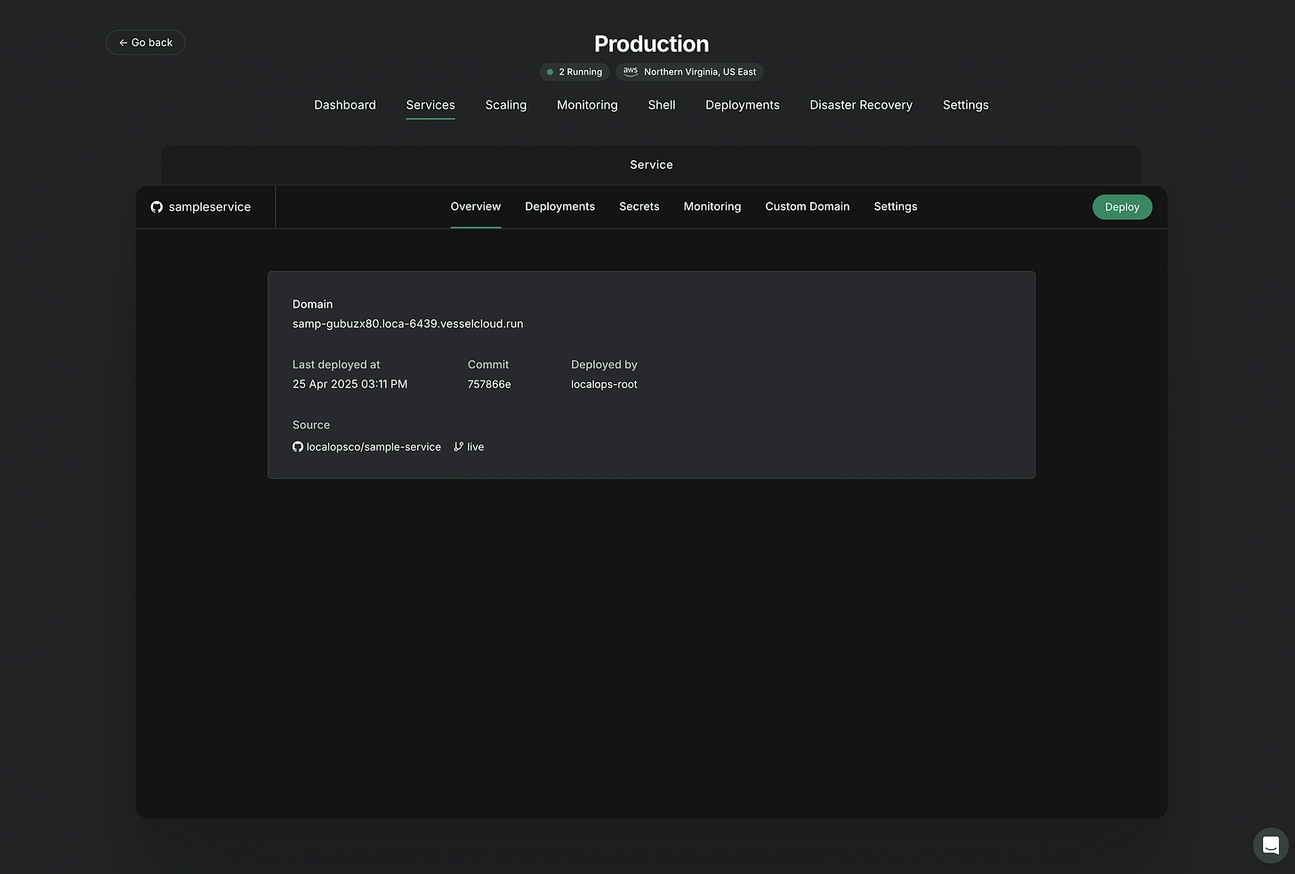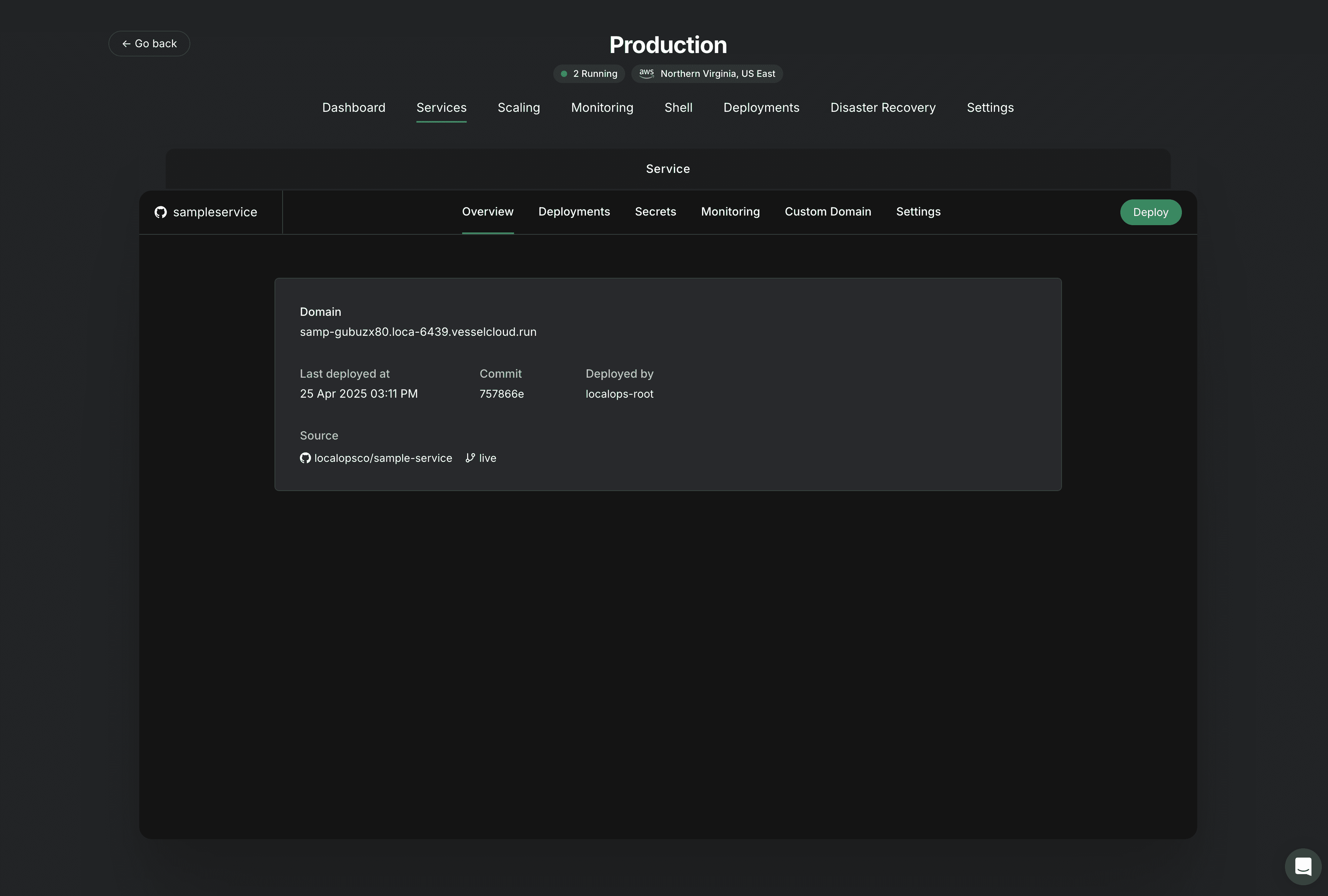 When you create a new service, configure a specific git repository and branch name in it. Whenever your team pushes new code to that branch, LocalOps will automatically pull the latest commit, build and push a new deployment to your environment. We will show build & deployment logs right there in the UI.