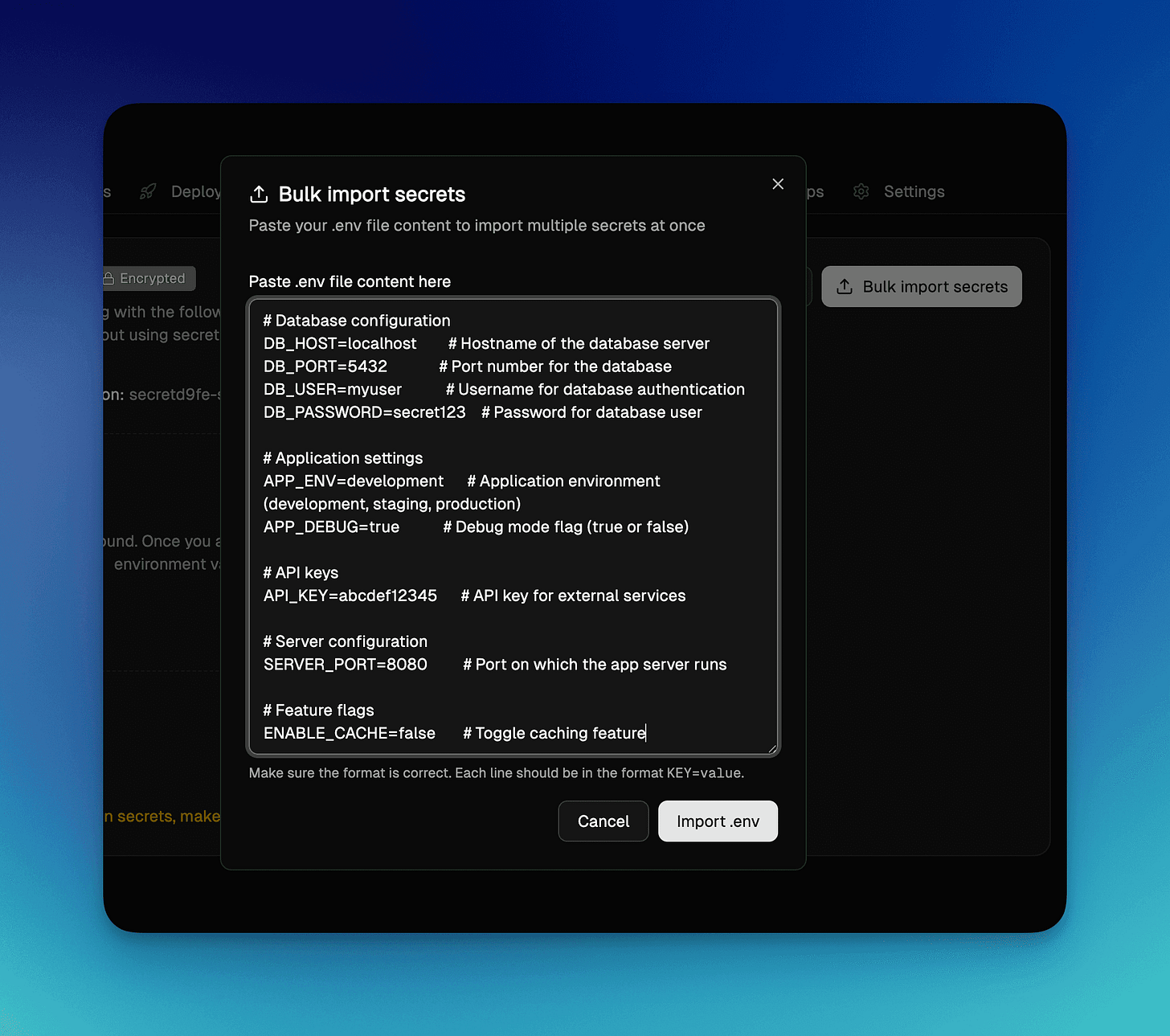 ENABLE_CACHE=false # Toggle caching featureBulk import/update secrets: