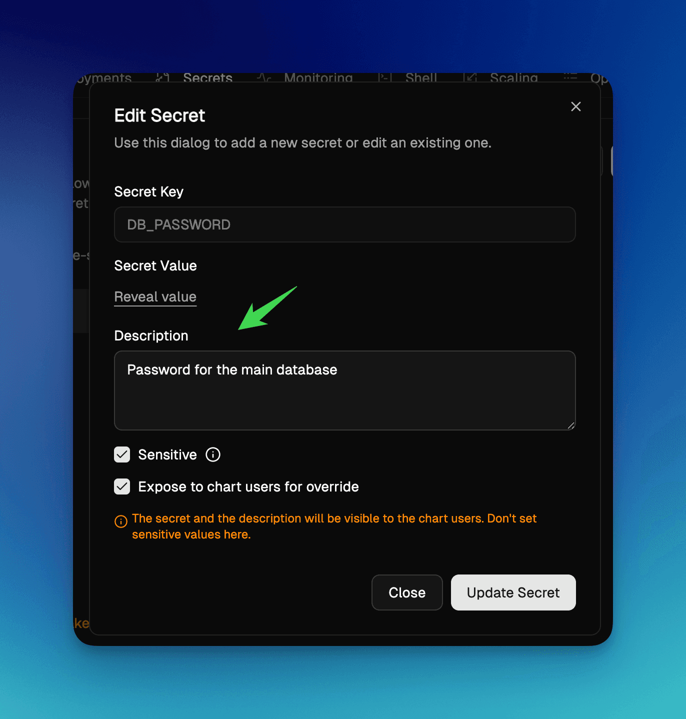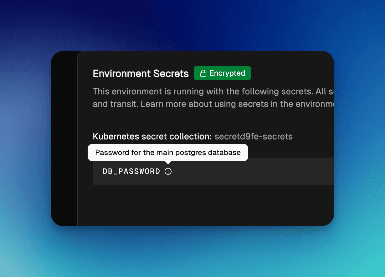 DB_PASSWORD=secret123 # Password for main postgres databaseIn secrets section, you can now add comments by editing the secret and adding a “description”.