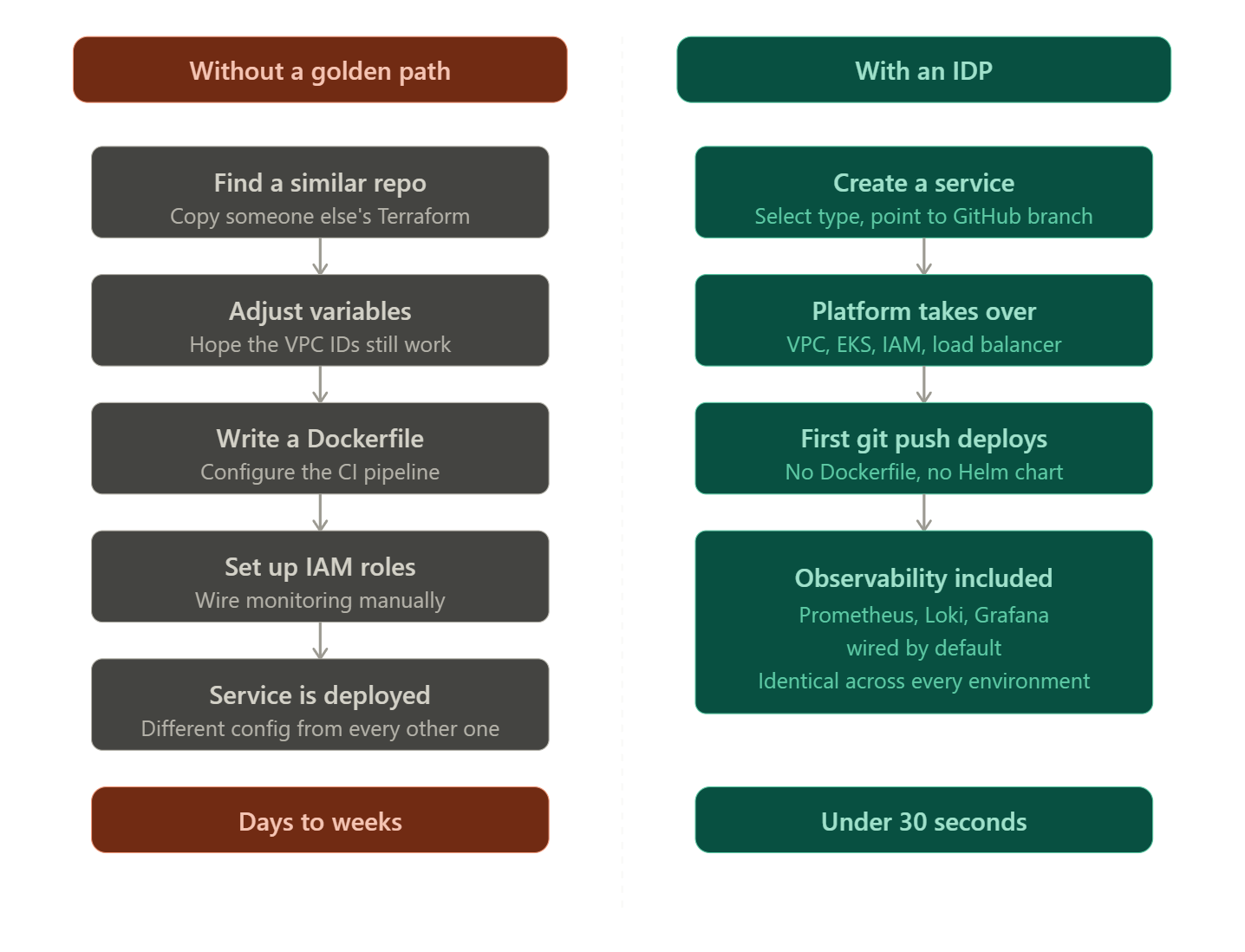 Without a golden path, spinning up a new service looks like this. The developer checks what the last team did, finds a repo with a vaguely similar setup, copies the Terraform, adjusts the variables, hopes the VPC IDs are still valid, writes a Dockerfile, figures out the CI pipeline configuration, sets up IAM roles, and then manually wires up monitoring after the first deployment. That process takes days. Sometimes weeks. And it produces another slightly different configuration that the next person will copy.