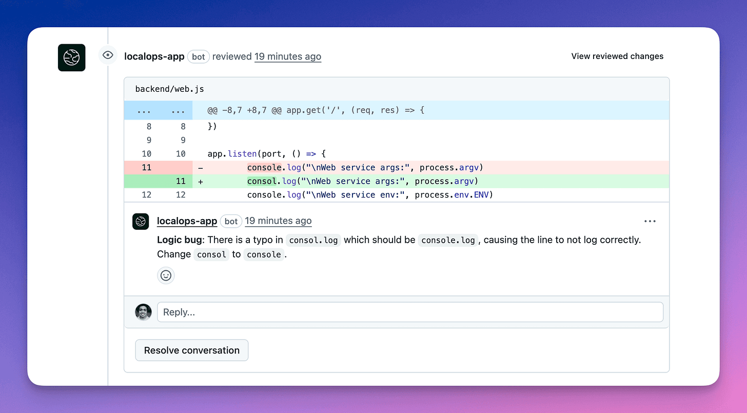We are releasing a beta version of AI code reviews today in LocalOps to let code reviews be a blissful process in your team instead of being a necessary bottleneck.
