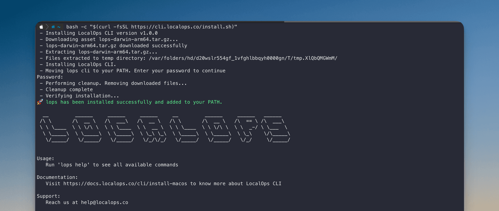 Install LocalOps CLI by running the following command in your MacOS terminal/iTerm: