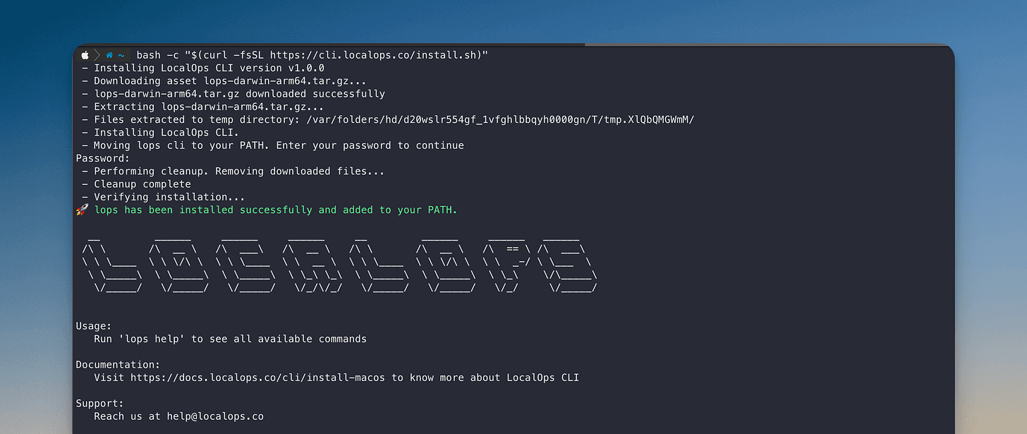 bash -c “$(curl -fsSL https://cli.localops.co/install.sh)”If you are using Windows, checkout install instructions here - https://docs.localops.co/category/cli