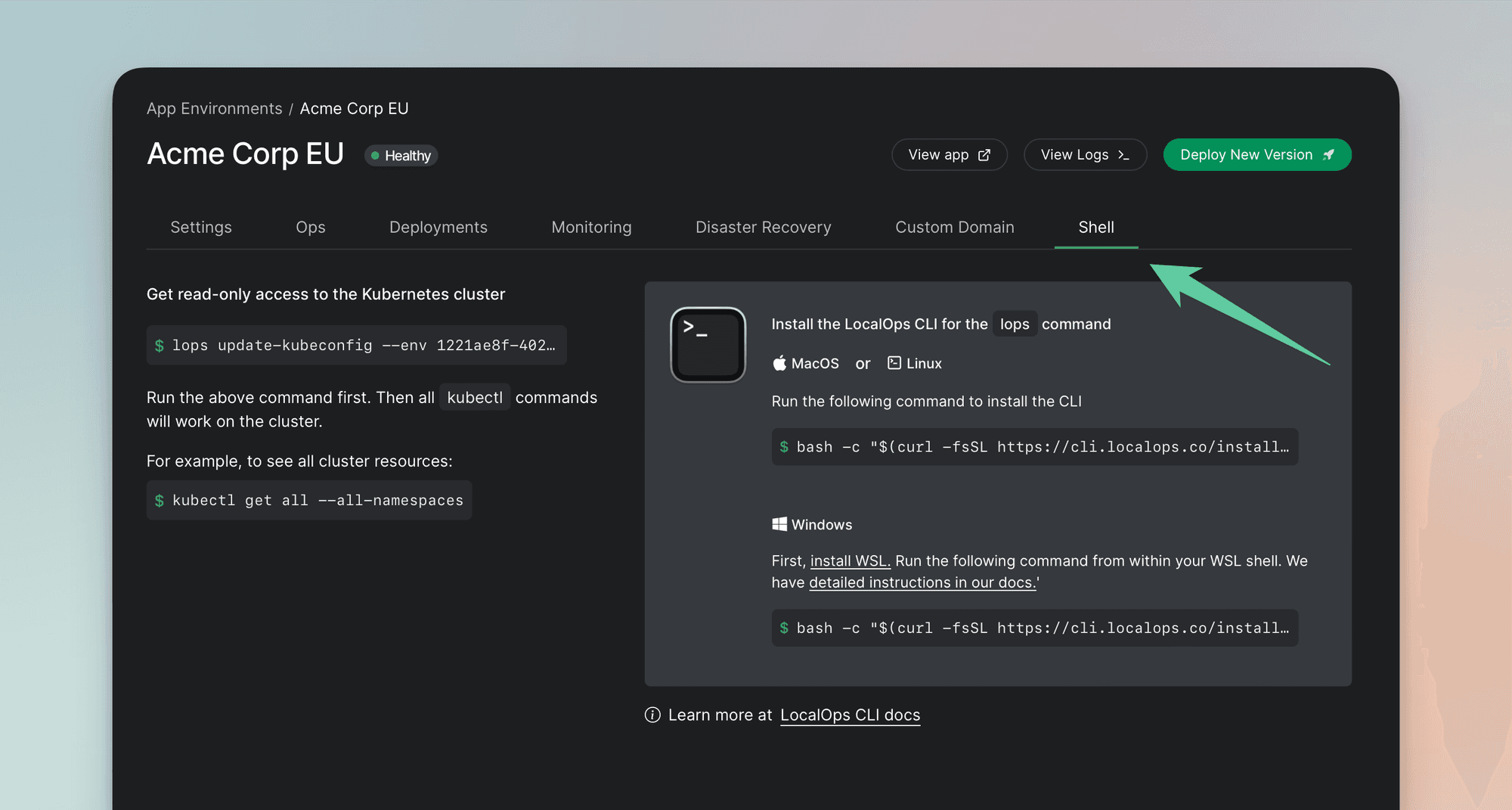 ops update-kubeconfig --env 1221ae8f-4024-4e45-ae3e-99f4cececd73The --env argument is specific to a given App Environment. Follow instructions in the new ✨Shell✨tab to get the correct environment ID.