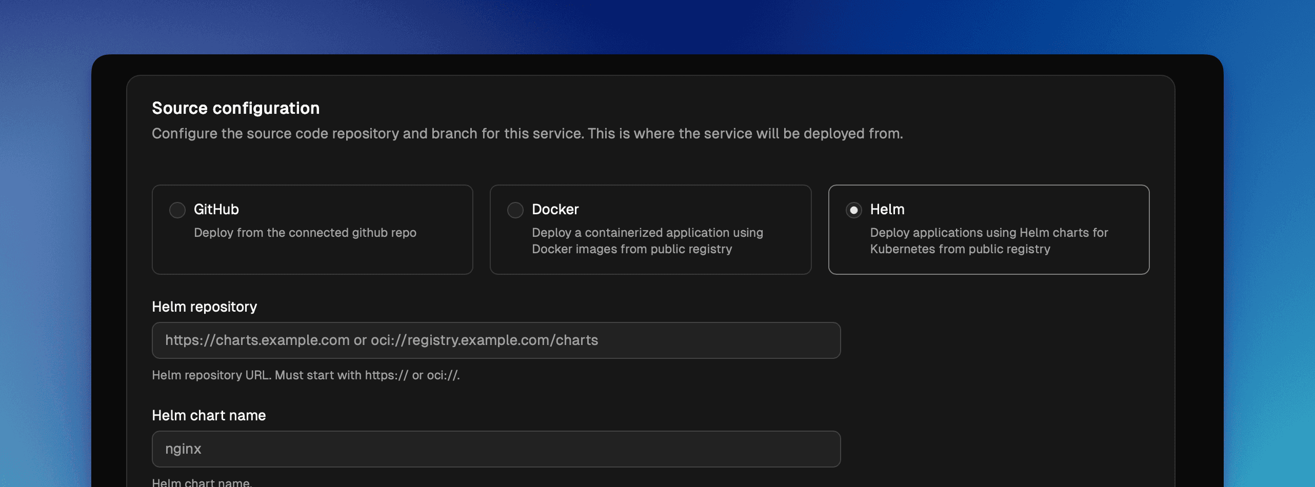 While creating a service, just pick the Source to be “Helm chart”. And provide Helm chart repo and Helm chart name.
